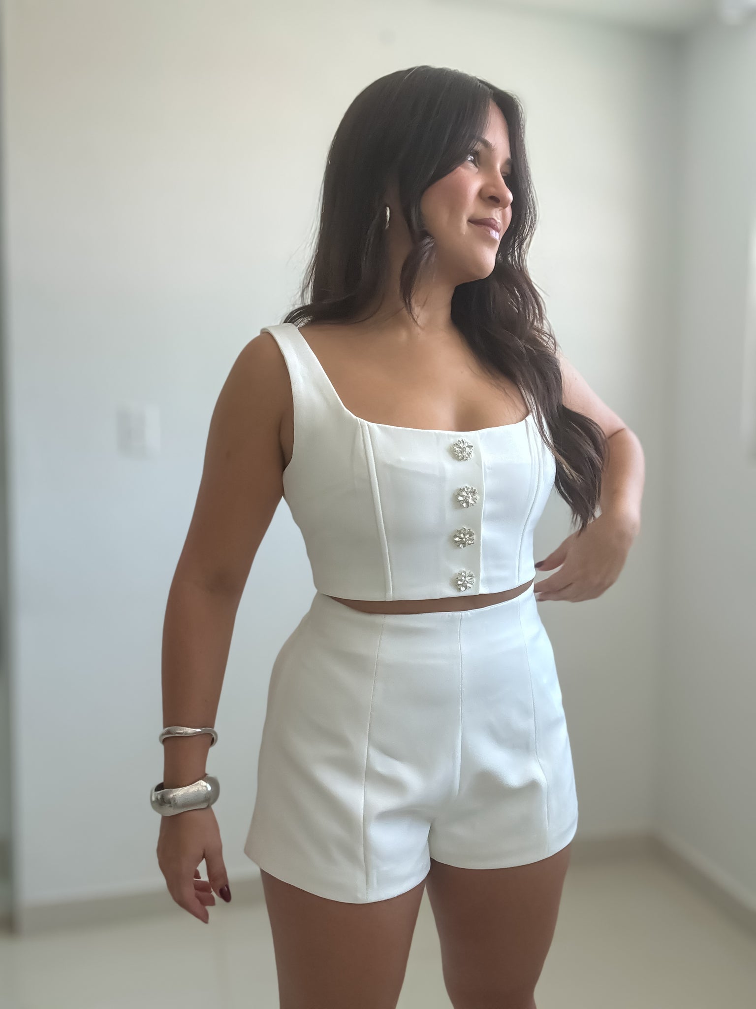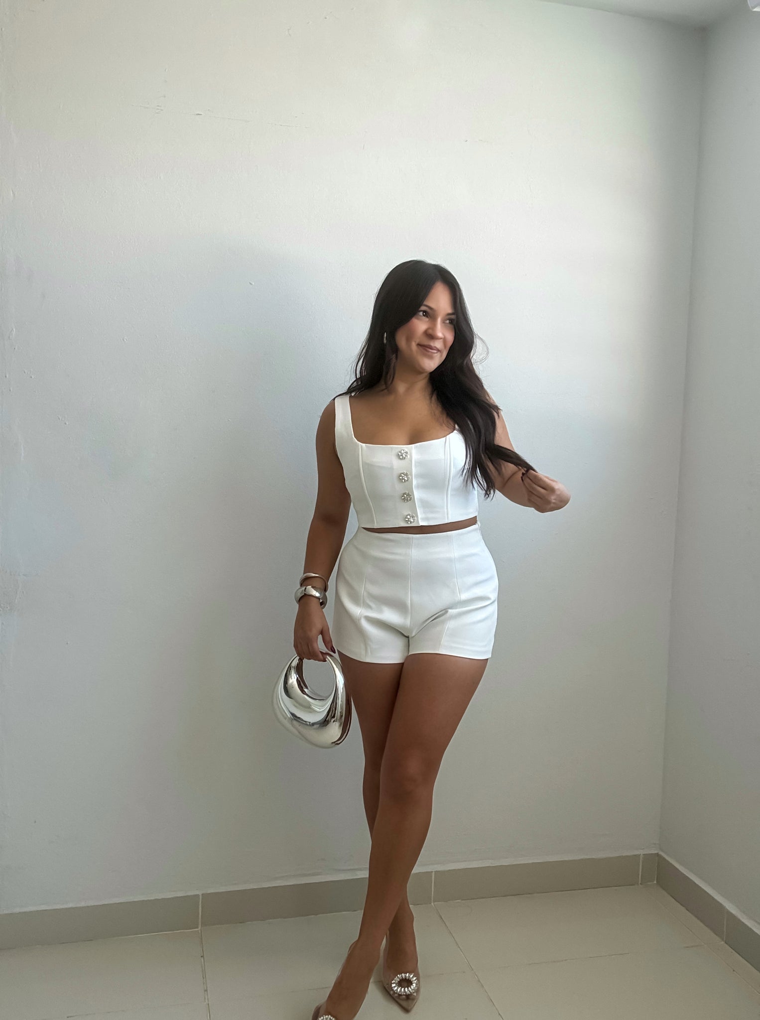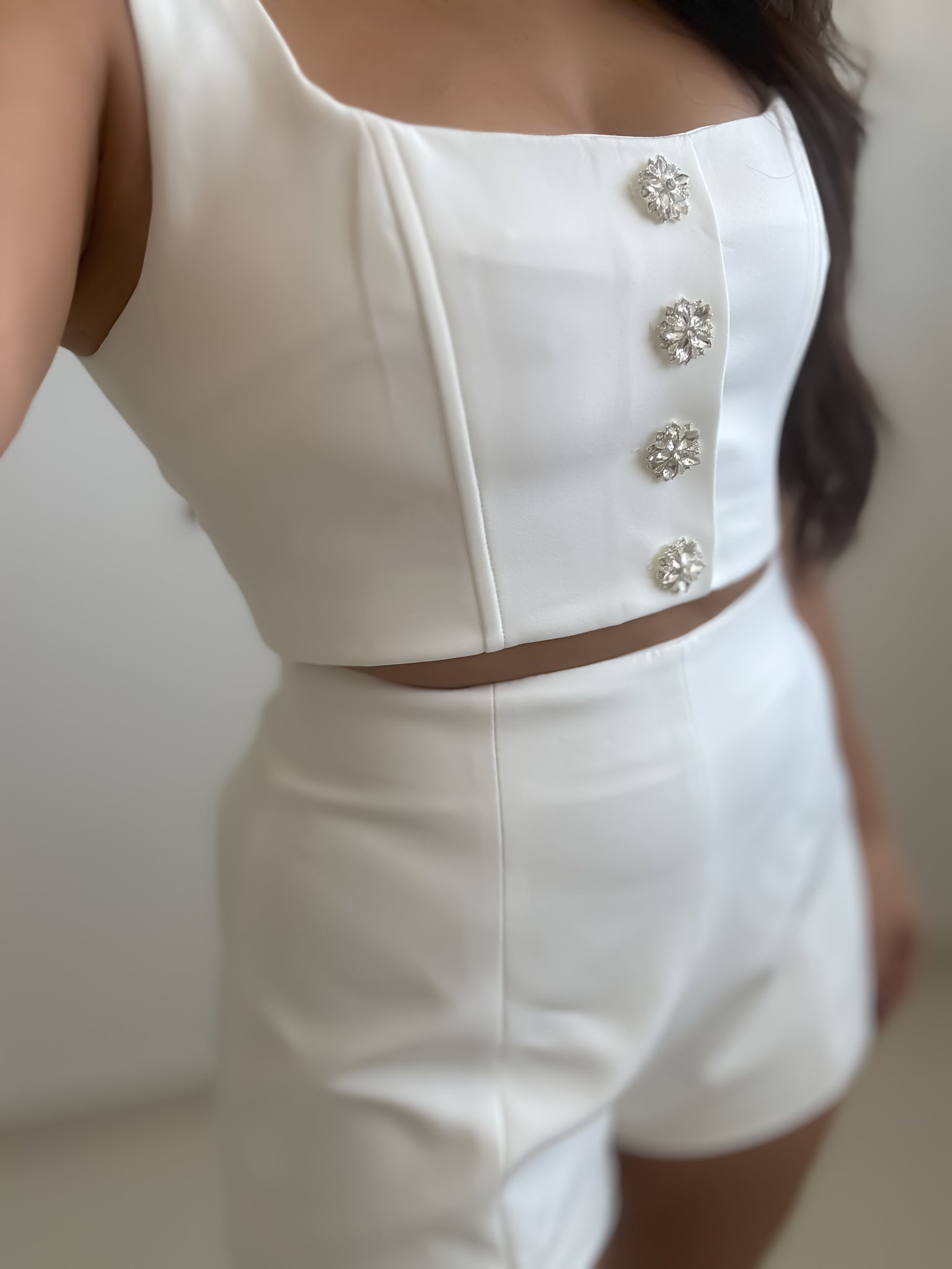 This structured two-piece set blends elegance with a tailored edge. The crop top features wide straps, a square neckline, crystal-embellished buttons, and a hidden side zipper for a sleek, secure fit. Paired with high-waist shorts designed with clean pleats and a flattering silhouette, the bottoms also feature a concealed side zipper to maintain a smooth look. This set balances minimalism with a touch of glam. Model is wearing size medium.
